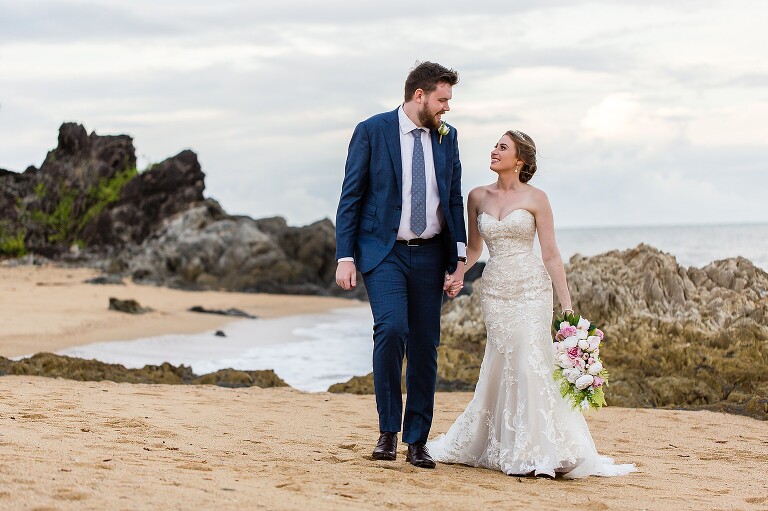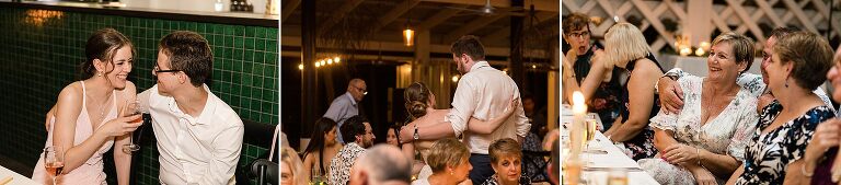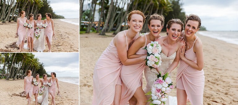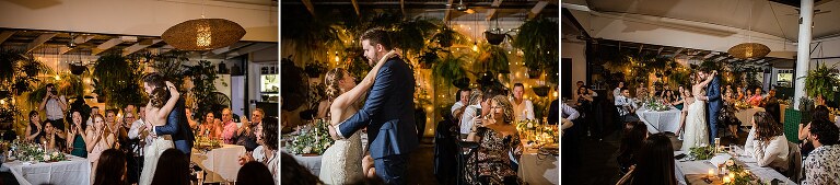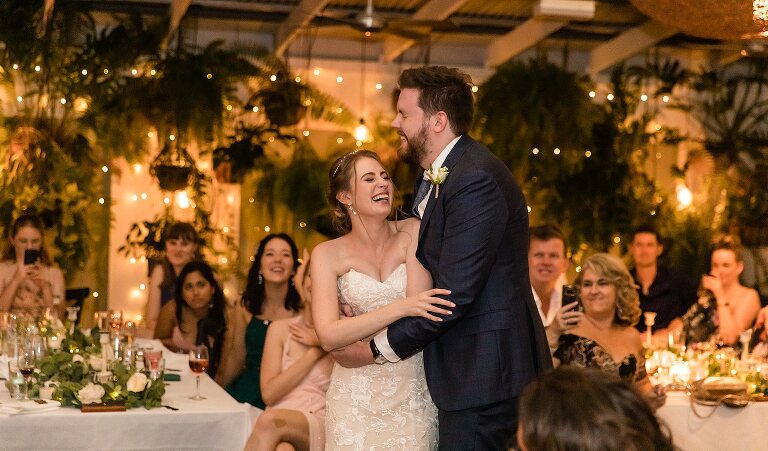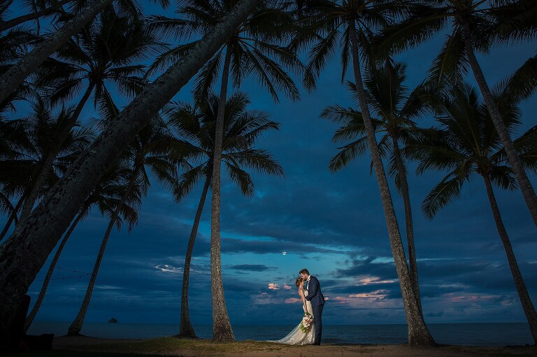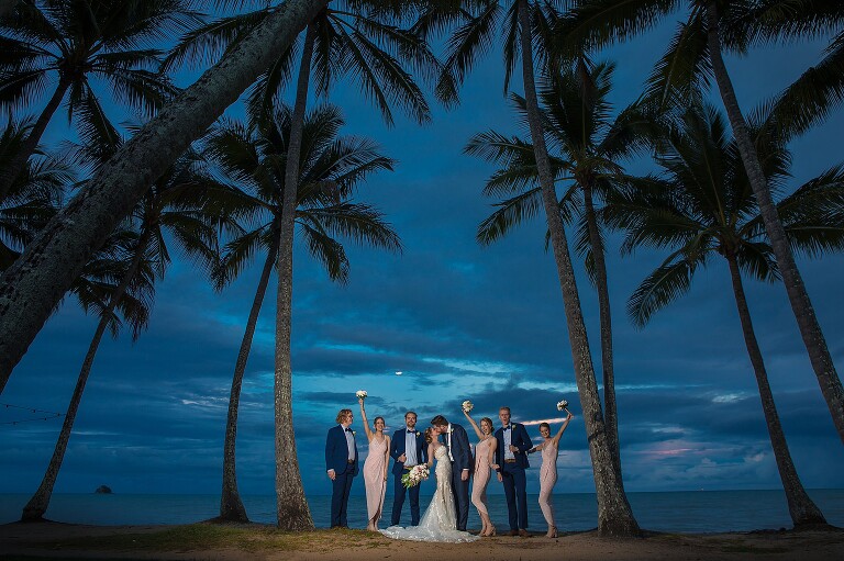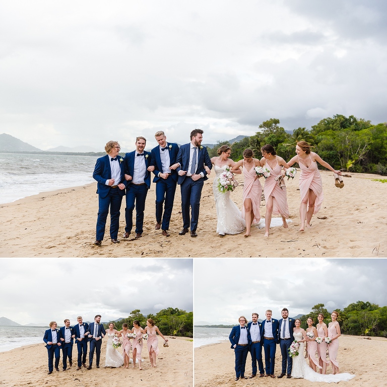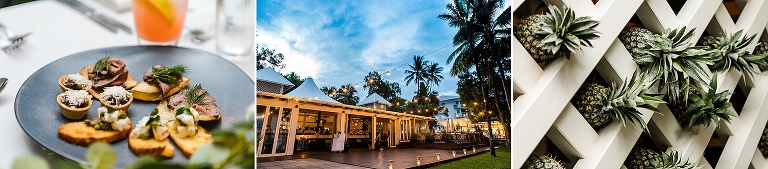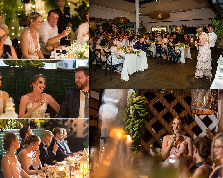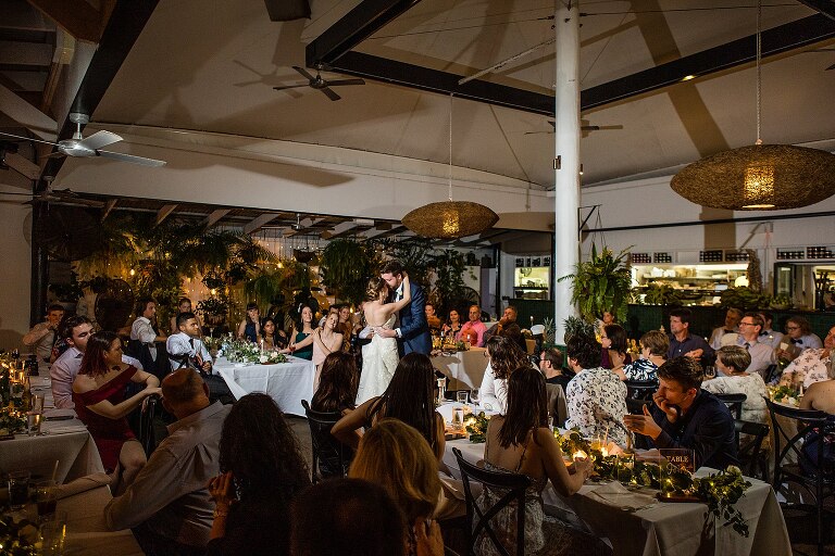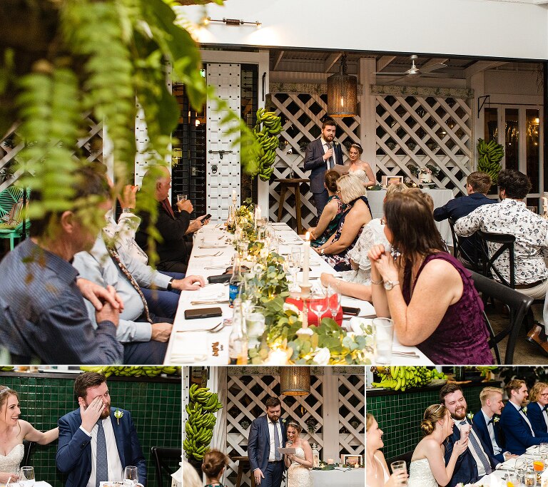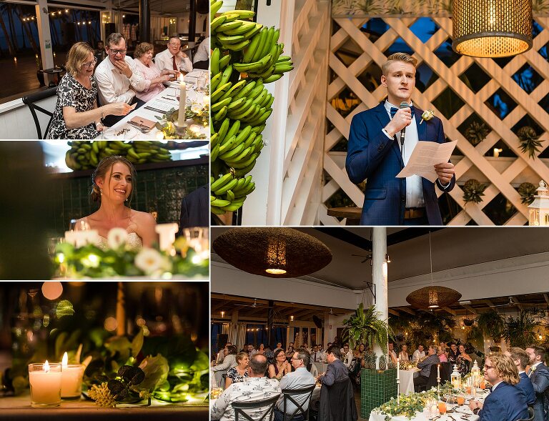 Not long after the ceremony heavy winds hit the beach. We all quickly paraded around then hid for cover! As soon as it came it left so we were able to drive down to the jetty/headlands for some last sunlit imagery! The beachfront reception at Nu Nu was all you could ever dream with the styling of north tropical vibes – hanging bananas, pineapples, and lush greenery intermixed with wax candles.