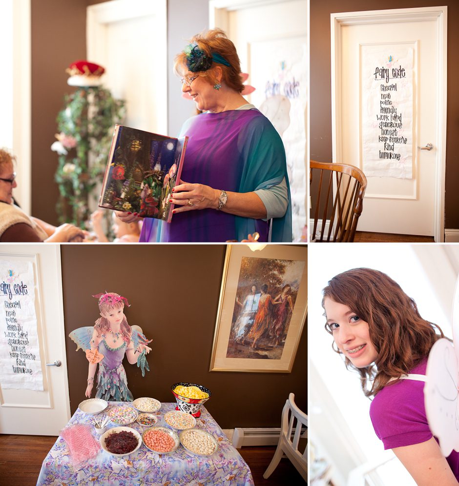 Rebecca is the proprietor, and is the ultimate host! Here she is showing the most intricate fairy book I’ve ever seen. I was always fascinated by the idea of fairies as a little girl myself. She planned special fairy treats each pixie could dip into and have their fill… Fairy Natalie was the seating host and lead the reading of the fairy code (each guest was given the code as a bookmark). The fairy code was also posted as decor for all to read and remember to be cheerful, neat, polite, friendly, work hard, generous, honest, keep secrets, kind, and humorous.