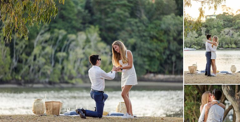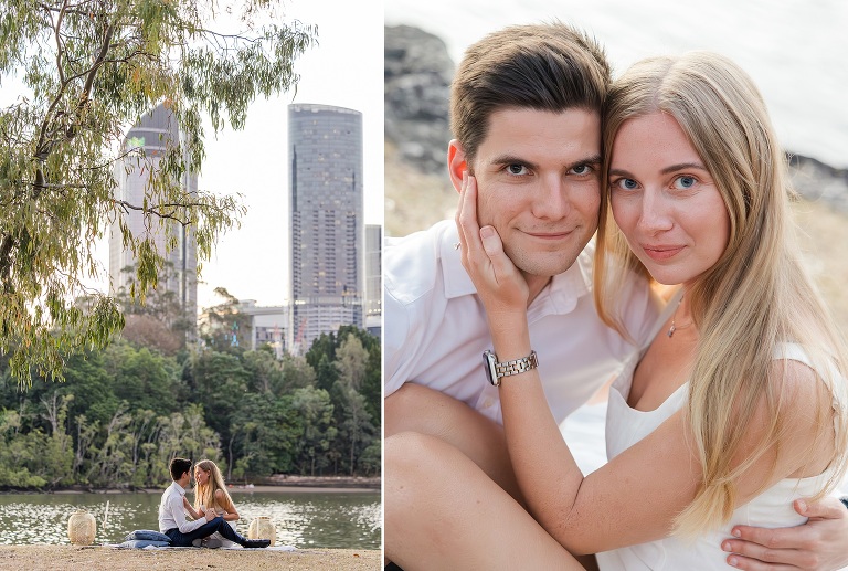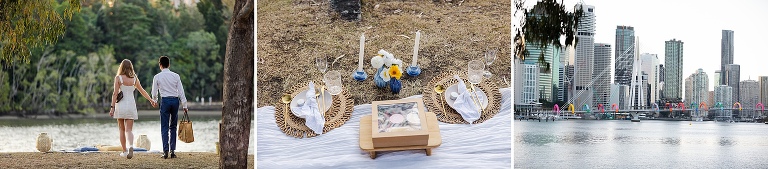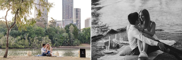 Jasper planned the evening beautifully. After a romantic dinner, he suggested a walk down to the lower park at Kangaroo Point Cliffs. Waiting for them was a styled picnic setup complete with cushions, florals, and a grazing platter — the perfect disguise for what was about to happen.