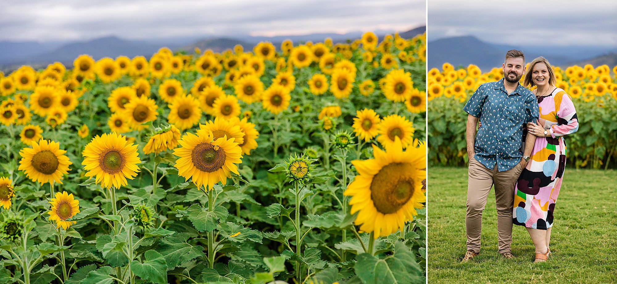 The closest sunflower farm from Brisbane is just an hour away, located at Kalbar. Kalbar Sunflower Farm is a pretty special place as it’s on the scenic rim trail and surrounded by rolling mountains. You can’t get any brighter or happier photos than with a field full of sunflowers. During their sunflower festival time they have food trucks on site and you can pick and cut your own stems at just $2. When there aren’t sunflowers blooming (2-3 week prime season), they have wildflower fields (Scenic Rim Flower Farm) where you can pick your own bucket. This farm is quite the central spot for activities as they host morning yoga classes, sip and paint sessions, cooking classes, live music events, weddings, and so on! We were super excited this season to be given exclusive access for our clients for sunset photography sessions.