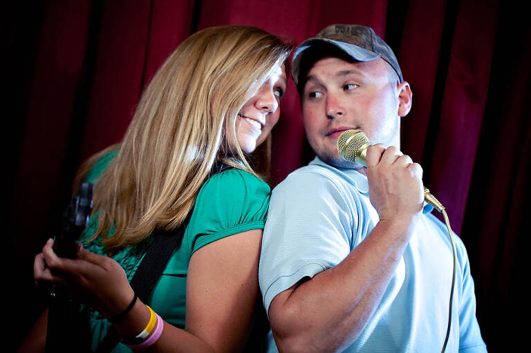So we went to a Comedy Club for Matt + Shelley’s engagement session. hahahha. No we didn’t. This is actually in my studio. We set it up to “look” like a stage with all the funky lights too. Even though we were “pretending” Matt really sang for us! 🙂
