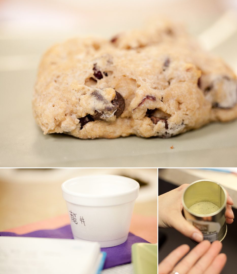 There are two main ways that green teas are processed. Pan fried and partially steamed. Teas that are just steamed are white teas. The pan frying creates a very natural or woodys taste in some. Others have a “food” taste. Green teas from Japan are higher in antioxidants. This is because they shade their trees to keep the chloroxidant, which you can see in the rich green brews. Green teas only last from 6-12 months at their peak taste. The far right (bottom) tea is called popcorn tea. This is a classic Japanese tea that was made out of economic necessity. My favorite was the top (middle), Monks Green. This tea had a light peachy taste. Yum. Inbetween sipping tea we had chocolate scones made from wheat flour. Really good!