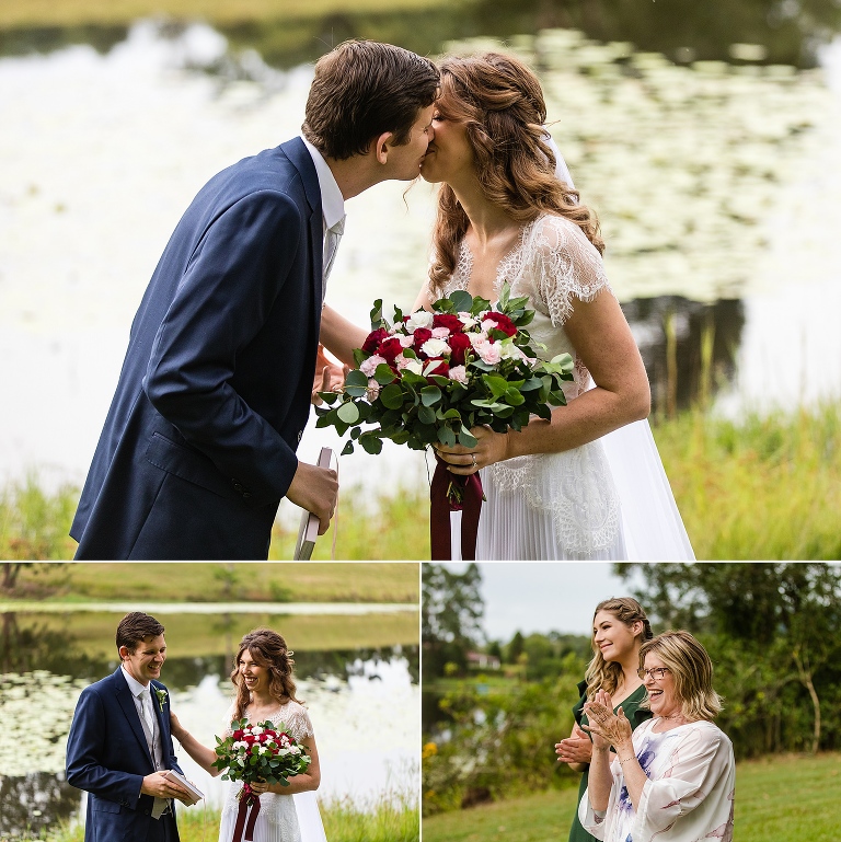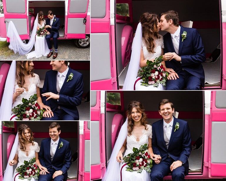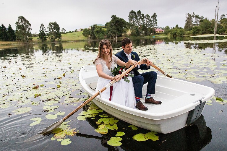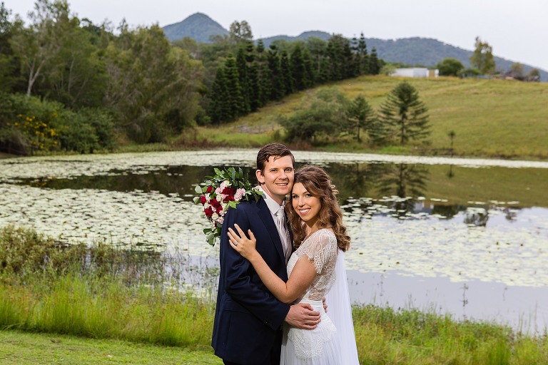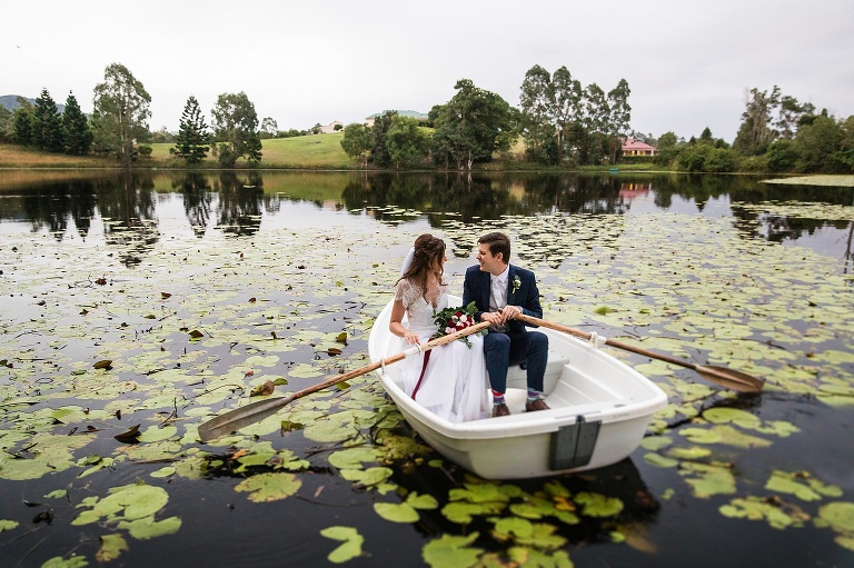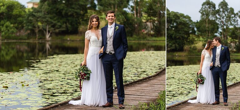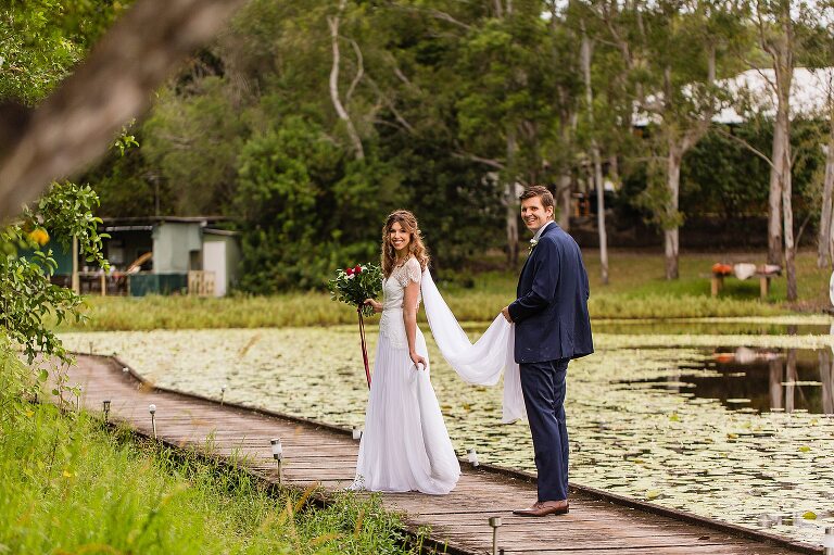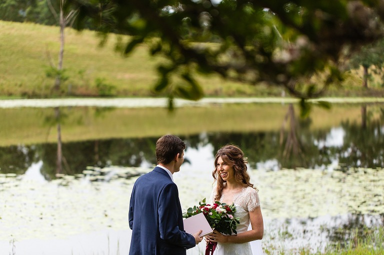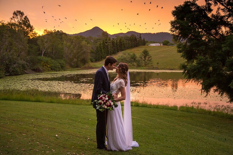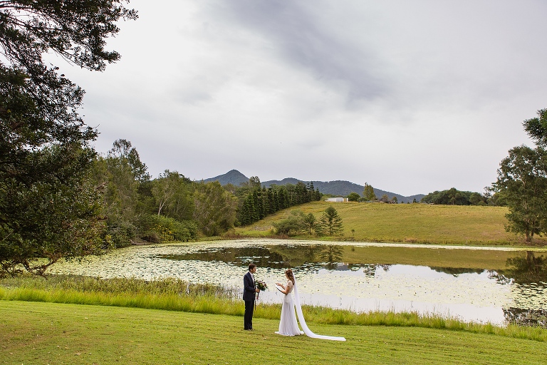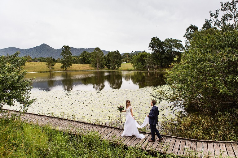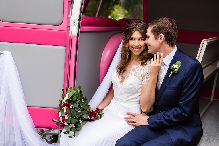 Nic + Cal hopped inside a pink Kombi van to exchange rings then walked across the boardwalk to their chosen spot to read hand written vows. The setting was beside a reflective lily pond surrounded by gorgeous mountain views. For an overcast day with drizzles of rain the sun just peeked out to make them glow! So many smiles and a champagne toast to soak in the last rays of the day, which did not disappoint to lighting up the sky a terracotta orange. Best wishes for you both this year and we will do it all again next year surrounded by your loved ones!