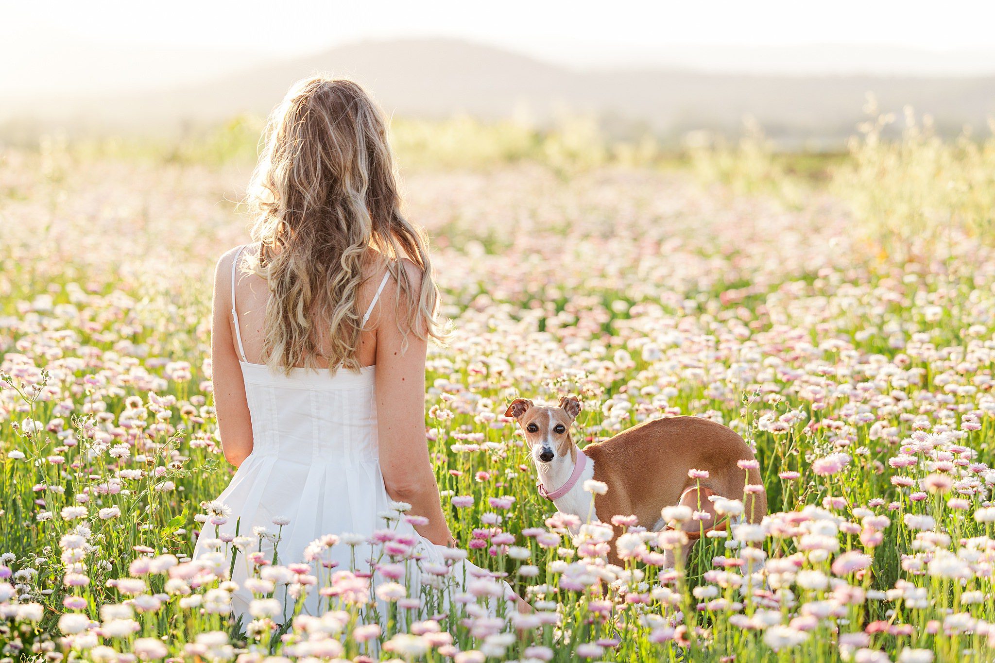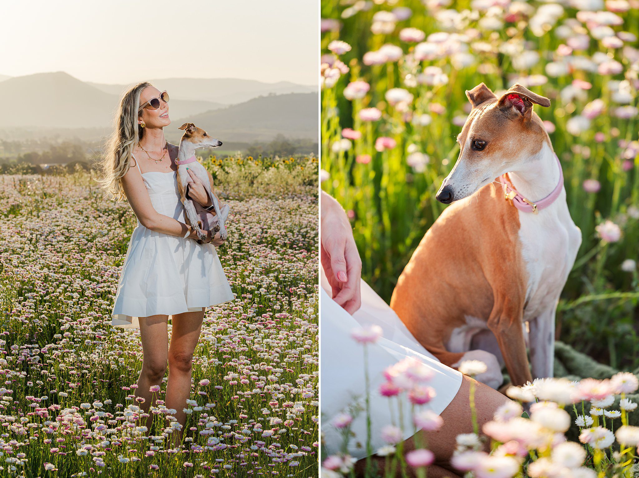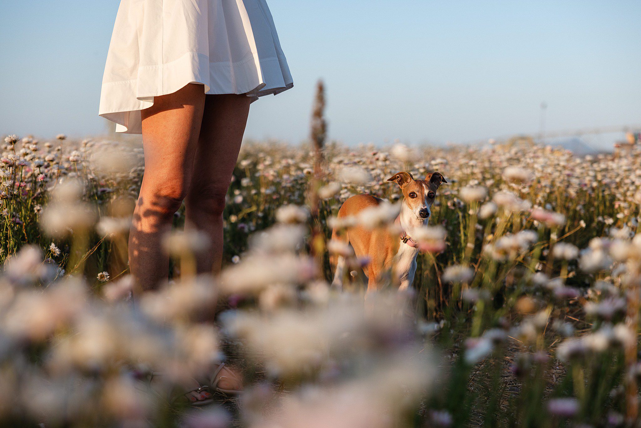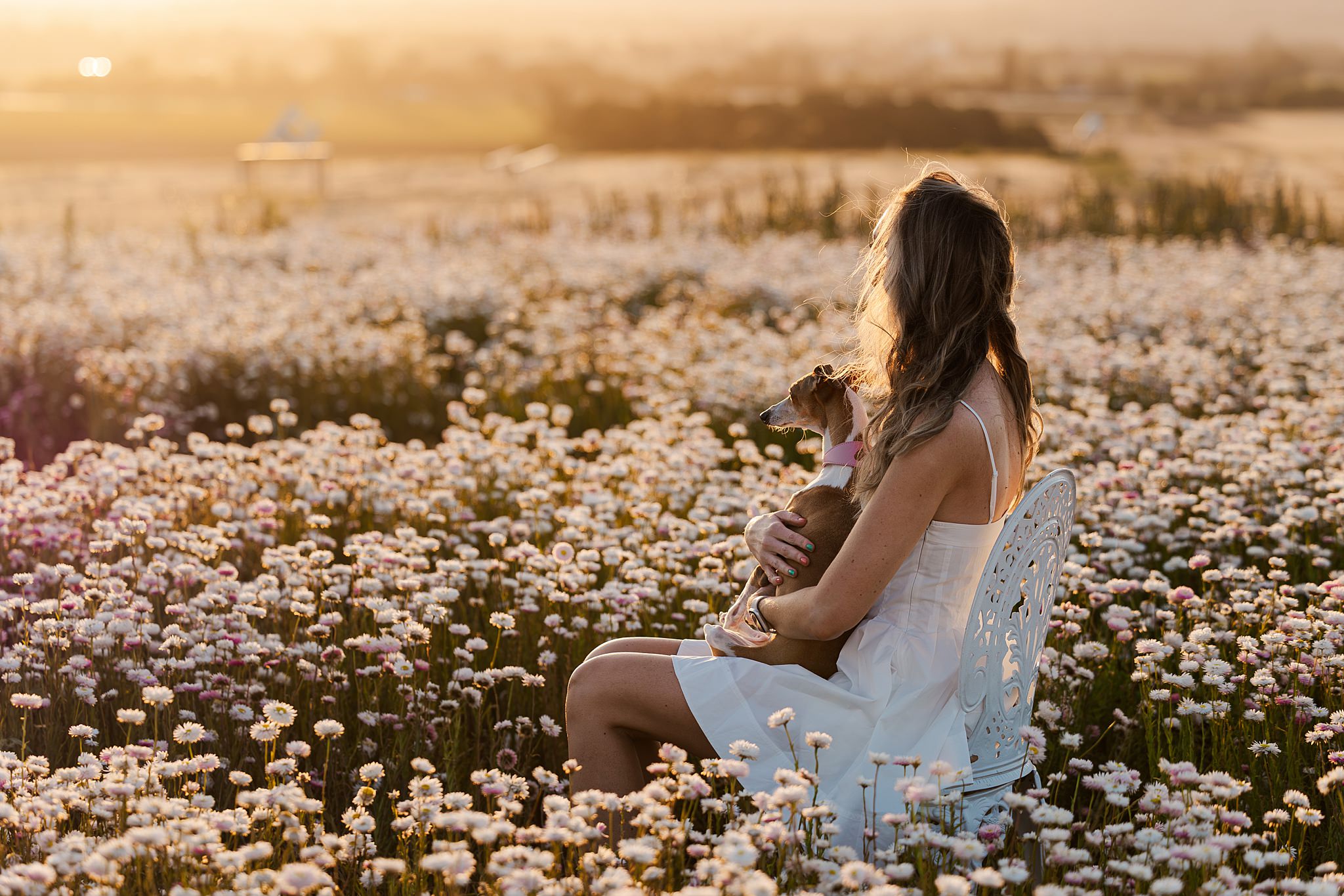 A golden afternoon out at the Scenic Rim Flower Farm, soft breeze drifting through the rows of white daisies, and one elegant little Italian Greyhound named Nala stealing the show.