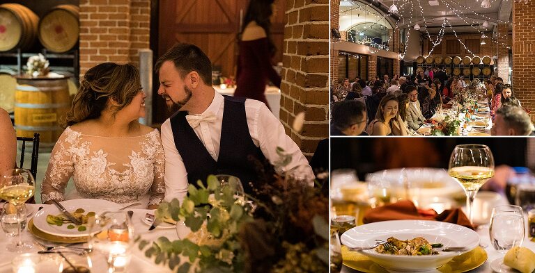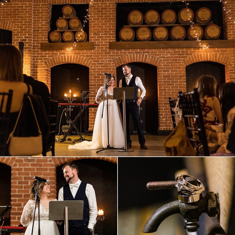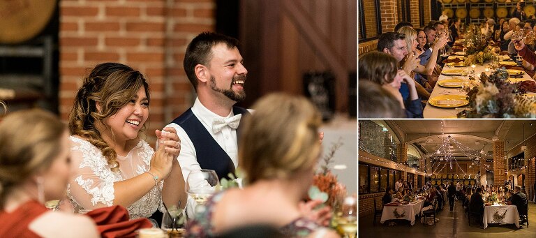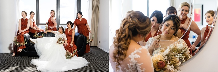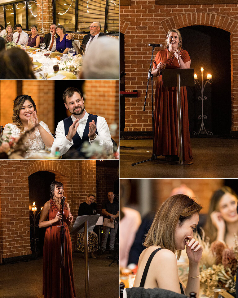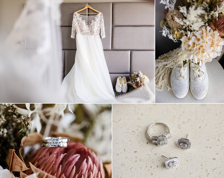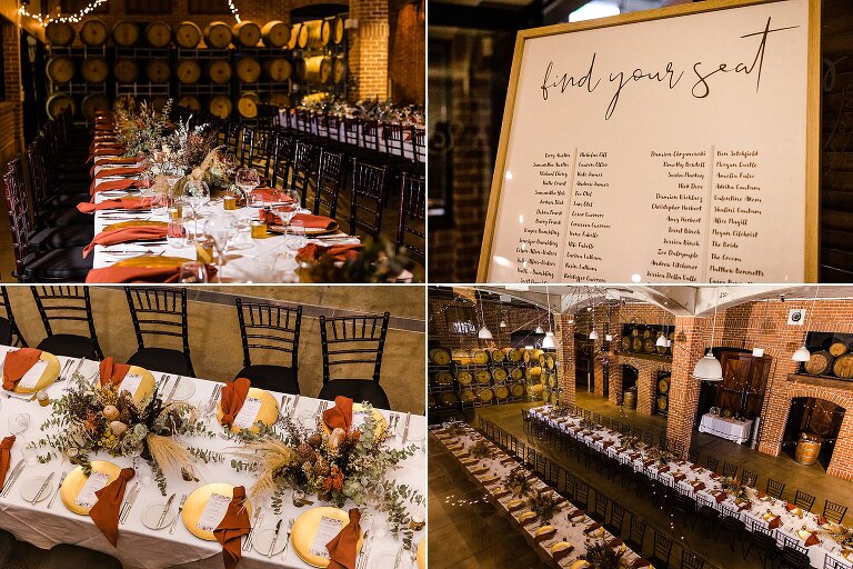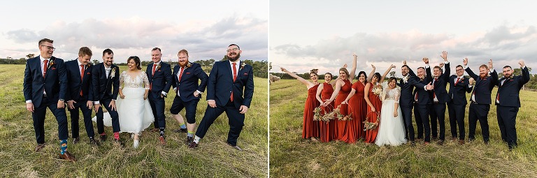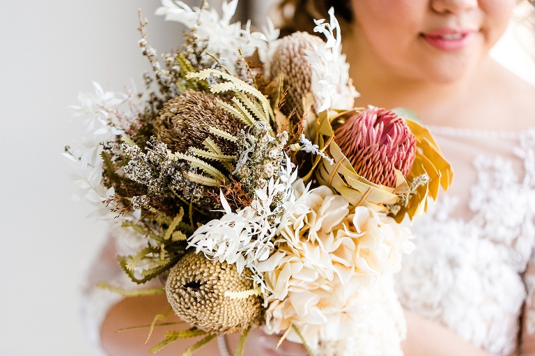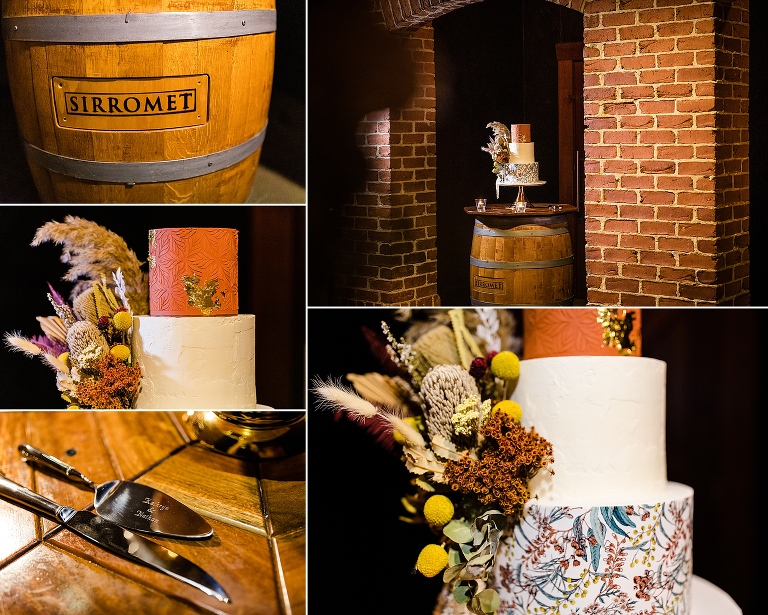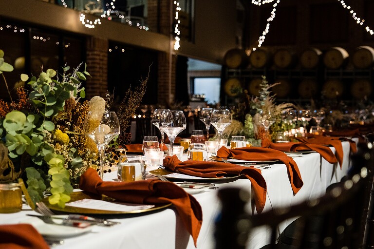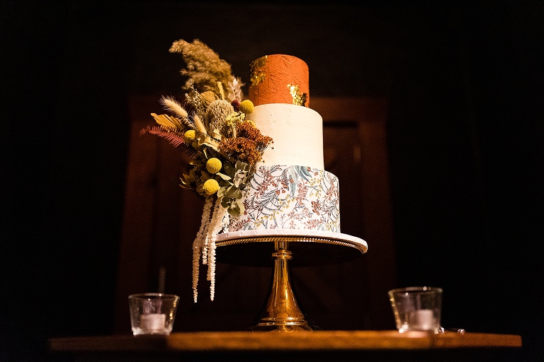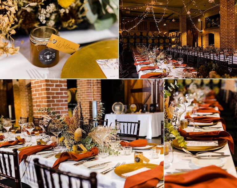 It was really the Barrel Hall that set the tone of our wedding decor! I chose the gorgeous rust colour of the bridesmaids dresses to dried preserved native florals to really complement the warm moody tone of the Barrel Hall and I think it came together really well! Also because I surrounded myself with super talented vendors I just came together like a dream! I’m a very crafty person so I had to do a lot of elements myself and ended up doing the honey jar giveaways, signs, bridal party flowers myself and after sending photos of what i had done to Julie (Julie Vine Flowers) she matched the reception styling and flowers beautifully! Nathan jumped in on the cake design with myself and Zoe (Confetti Cake Co.) and after providing Zoe with some of my home dried flowers she worked an absolute masterpiece! I think overall our wedding style was very much just me and Nathan. I wore wedding sneakers and the groomsmen had funky socks! The dogs were at the wedding and our flower girl and page boy had bubble canons! It was very fun as well as beautiful and Nathan and I couldn’t have been happier at how everything gelled together in the end!