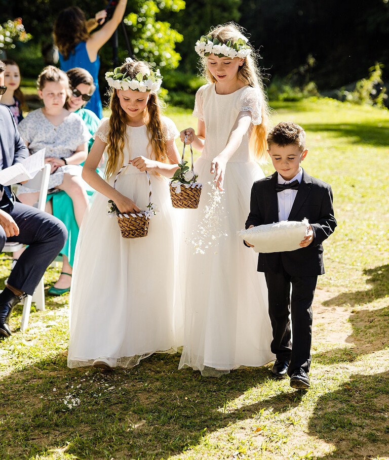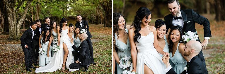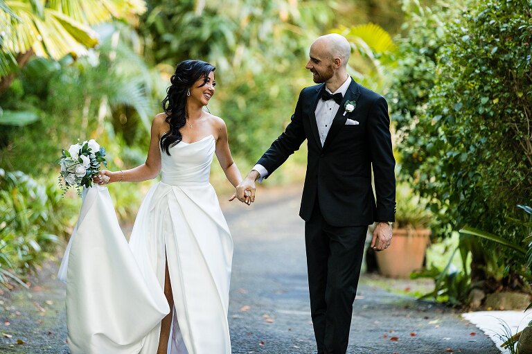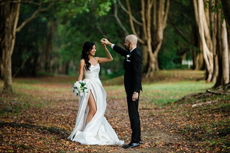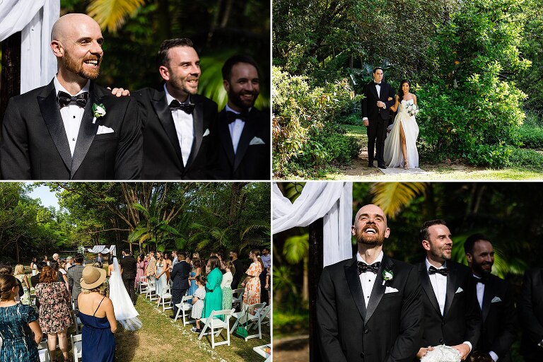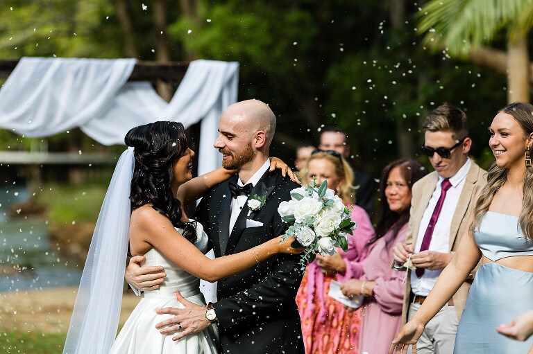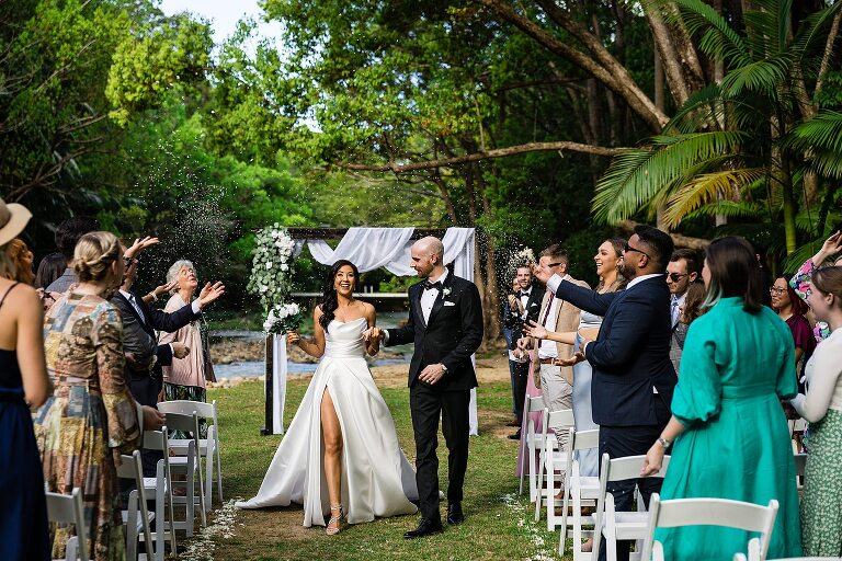 Sol Gardens Wedding venue is set in a cultivated tropical rainforest with Currumbin Creek running along side. Everywhere you look is pretty much amazing. It felt more like a relaxing retreat to us than a busy wedding day. Guests enjoyed the generous grounds for lawn games and tropical bar setting. A short stroll just outside the venue, is a park with gorgeous old growth trees. One of our favourite features of Sol Gardens in the unique entrance the wedding party makes. Guests are ushered out onto a veranda where the wedding party is in view across the pond and can do their own fun dances as they are announced walking across a wooden bridge.