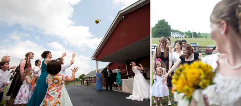 A friend signals to Sarah the direction to thrown the bouquet. Chris captured this great shot of the bouquet mid-air!