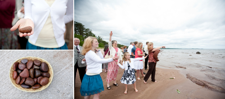 During the ceremony all the guests were given a rock to hold. Before the couple was announced man and wife they were told the significance of the rocks. Each rock was held with love and good wishes towards the couple. Before they were pronounced they could give blessings and well wishes to the couple on their stone and toss it into the lake. I almost got pelted in the head! The risks we photographers take trying to get requested shots…. this time I was standing in front of guests hurling rocks!