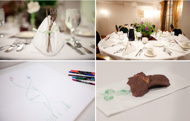 Centerpieces were potted plants with moss around the pot. Lavender accented each place setting and smelled amazing! The sign-in “book” was a canvas with colored markers for each guest to leave well wishes. Favors were local munchies… chocolate covered potato chips. Really yummy!